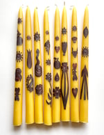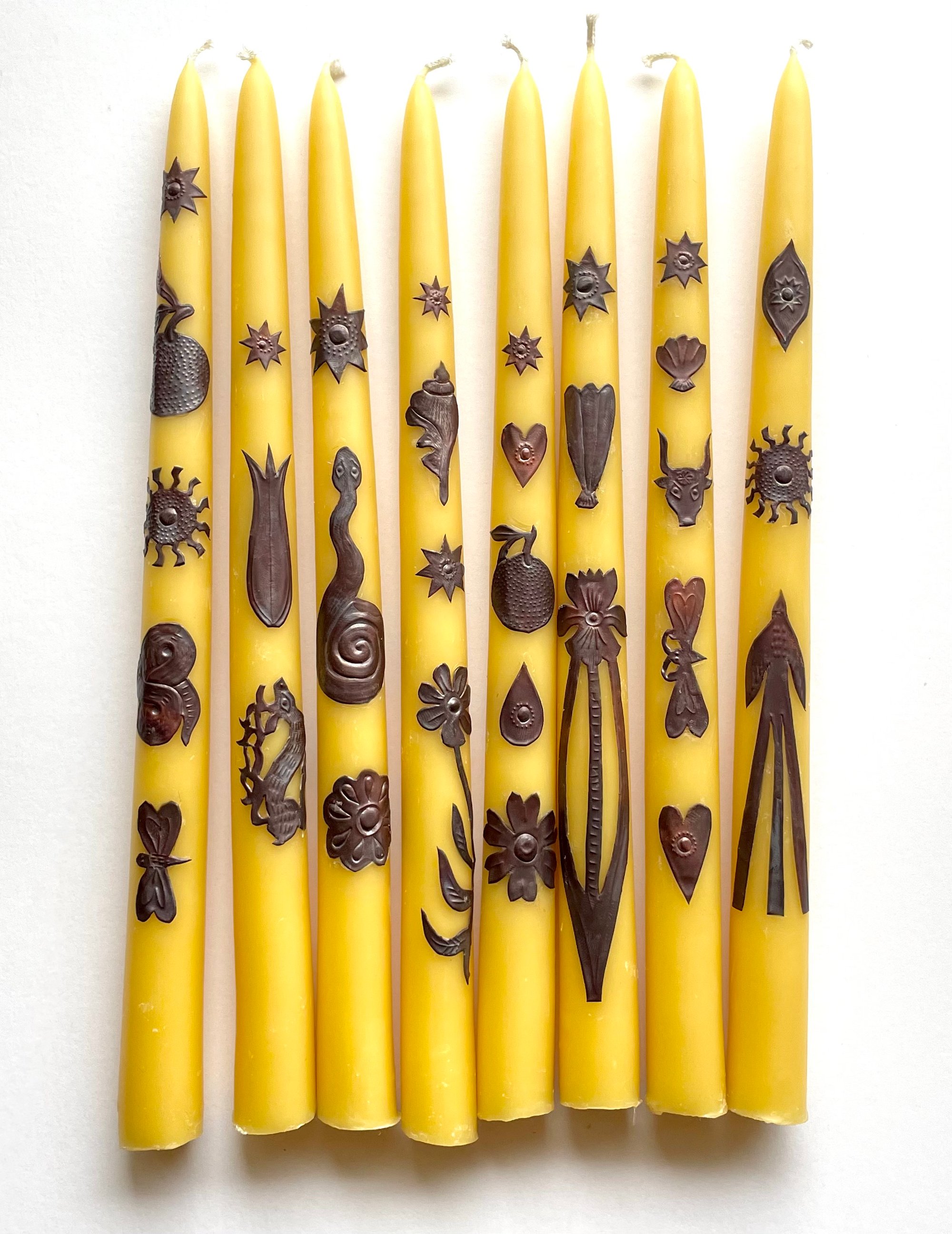 On these candles, bespoke imagery is hand cut and embossed from very thin copper and affixed to the beeswax with gentle heat. As the candle burns, the ephemeral wax will fall away from the copper, leaving behind the lasting metal charms.