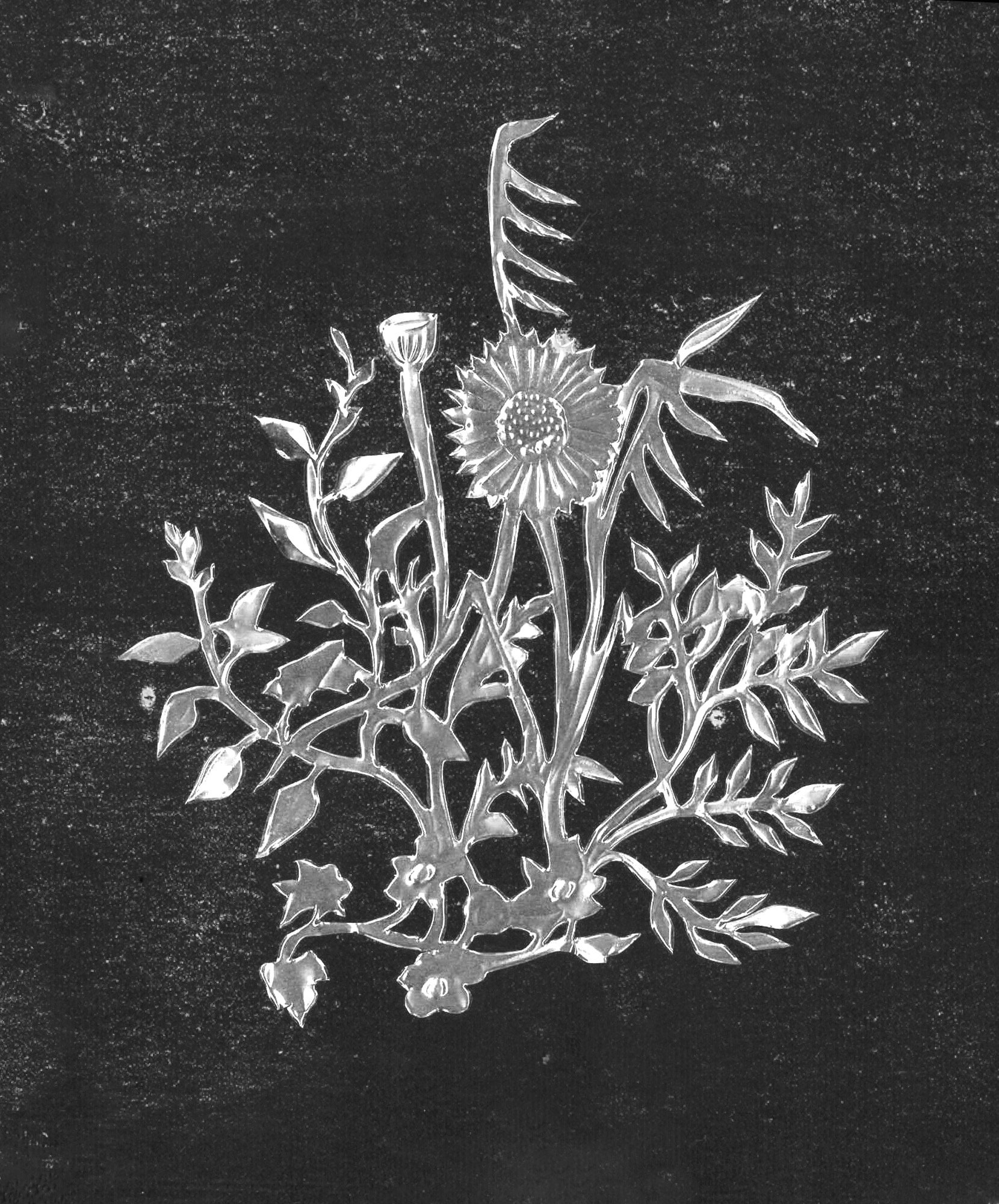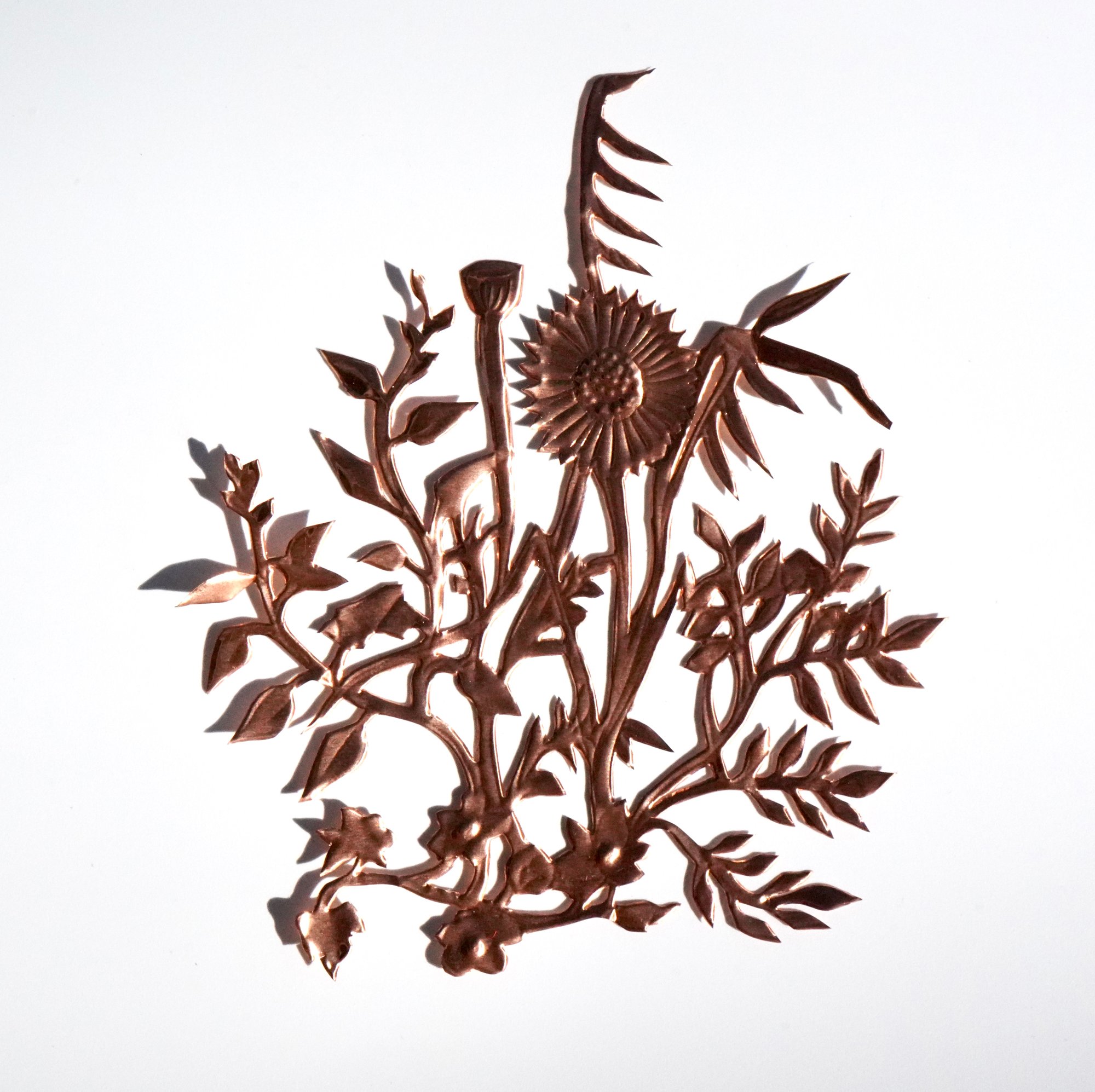 Hand cut and embossed copper sheet. Dimensions: 4"x 3 1/2.
